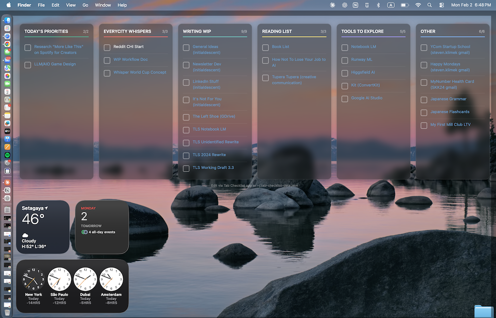 Finally got fed up and built a tiny macOS desktop widget to fix it: a transparent set of columns that act like checklists, floating over my wallpaper—so I can see what I’m supposed to be doing without hunting through a sea of tabs.