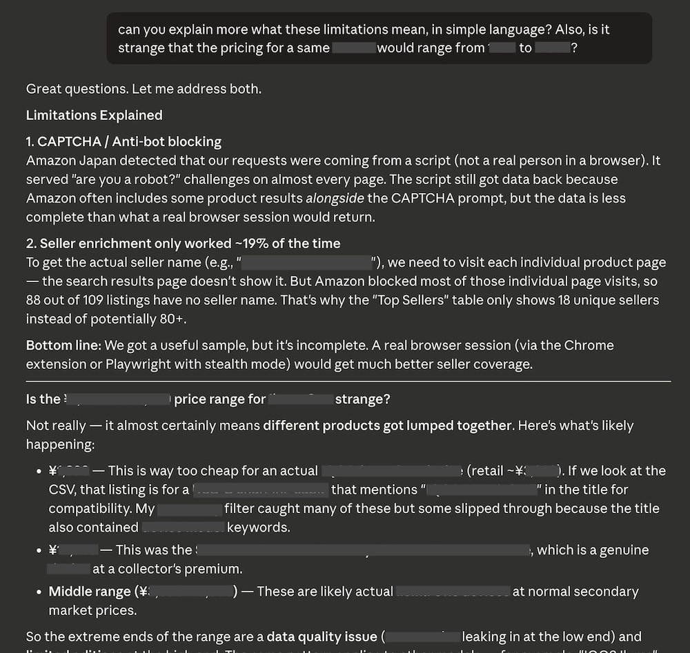 What I did instead: asked Claude Code to generate a scraper that collected search results across five queries (first 3 pages each) and normalized them into a structured dataset.